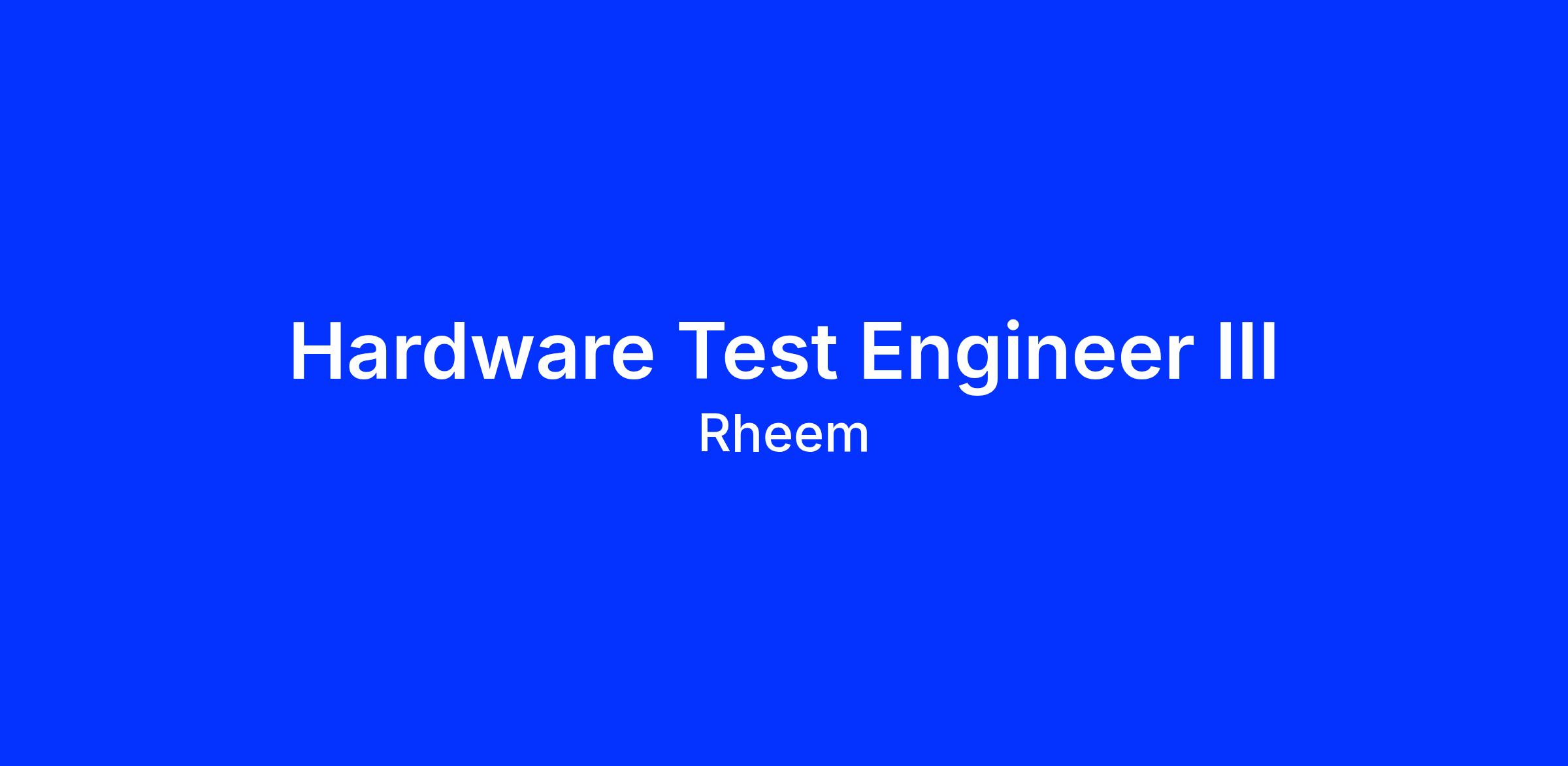 <div><strong>Description</strong><br/><p><span style='color: rgb(0, 0, 0); font-family: "Times New Roman";'><span style="-webkit-text-stroke-width: 0px; display: inline !important; float: none; font-size: medium; font-style: normal; font-variant-caps: normal; font-variant-ligatures: normal; font-weight: 400; letter-spacing: normal; orphans: 2; text-align: start; text-decoration-color: initial; text-decoration-style: initial; text-decoration-thickness: initial; text-indent: 0px; text-transform: none; white-space: normal; widows: 2; word-spacing: 0px;">The <strong>Hardware Test Engineer III</strong> is responsible for the testing and validation of new embedded microprocessor based electronic control designs and the support of contract manufacturers building controls for Rheem HVAC and water heating products including test requirements, test fixture design, component qualification, and life cycle support. Will work to improve DFM and DFT of controls within Rheem. This is a key position...