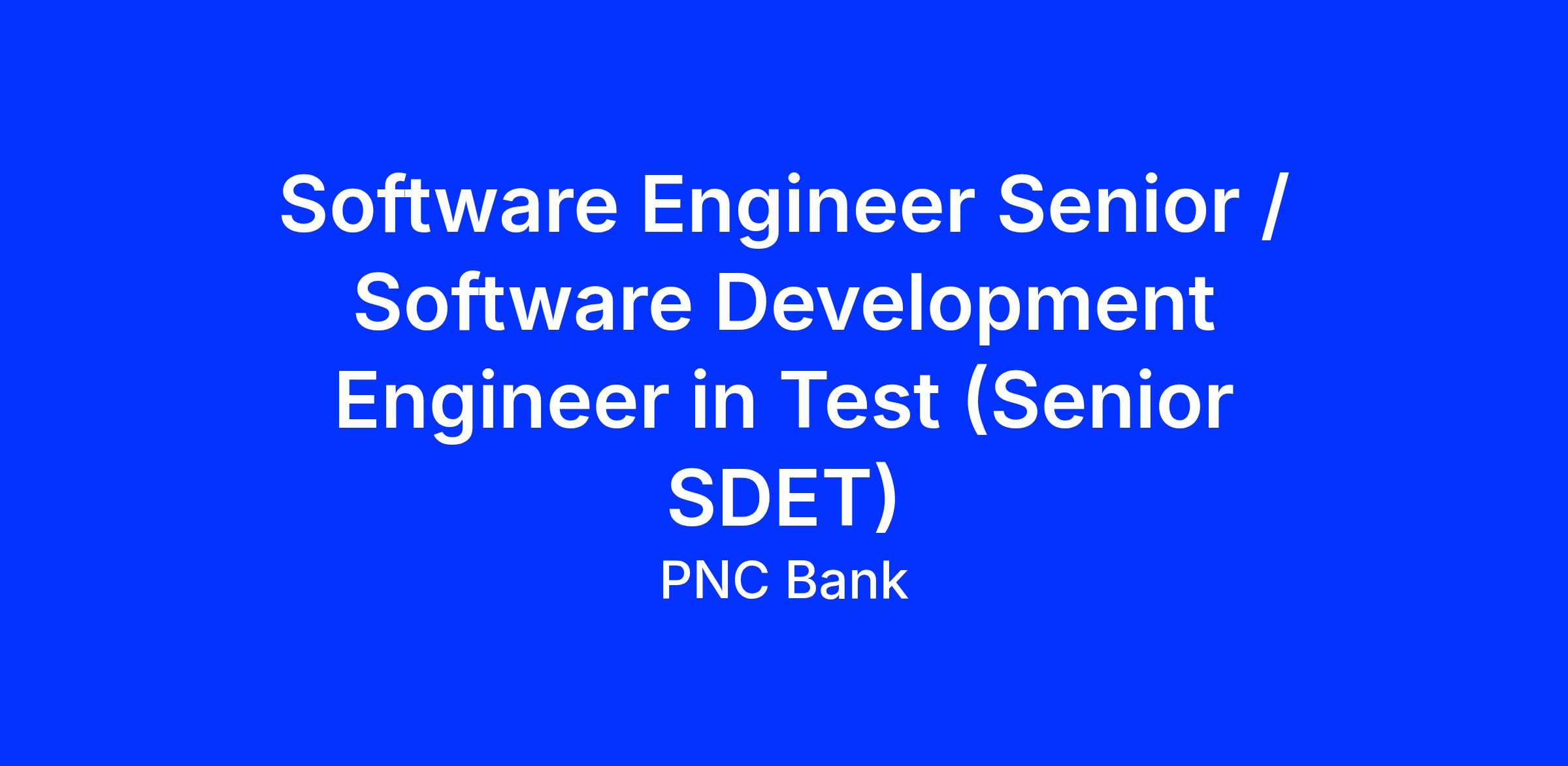 This position functions as a Senior Software Development Engineer in Test (SDET) As a Senior SDET within PNCβs Consumer Lending Originations Technology organization, you will play a critical role in leading quality strategy and test automation for large scale, enterprise initiatives. This role is ideal for a Senior Software Development Engineer in Test (SDET) who combines strong technical depth with hands on leadership, modern automation practices, and banking domain expertise. This position will be based in Pittsburgh, PA; Strongsville, OH; Birmingham, AL; or Dallas, TX.